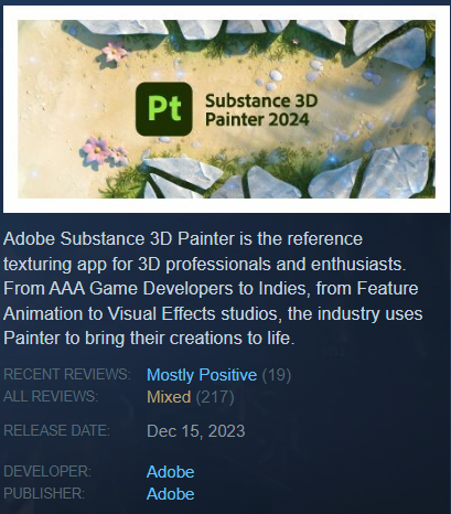 Originally developed by French software company Allegorithmic, in 2019 they were acquired by Omni Consumer Products—sorry, I mean Adobe, Inc.—folding its Substance wares into Adobe’s gaping maw. The Substances, however, are not a part of Adobe’s Creative Cloud suite and require an additional subscription. For individuals, this cost is (at the time of writing) $49.99 United States Dollars. (There is a perpetual license option available through Steam, with each program costing a not-entirely-unreasonable two-hundo, but reviews for these versions are quite literally mixed, citing compatibility issues and a lack of assets available in the subscription version.)